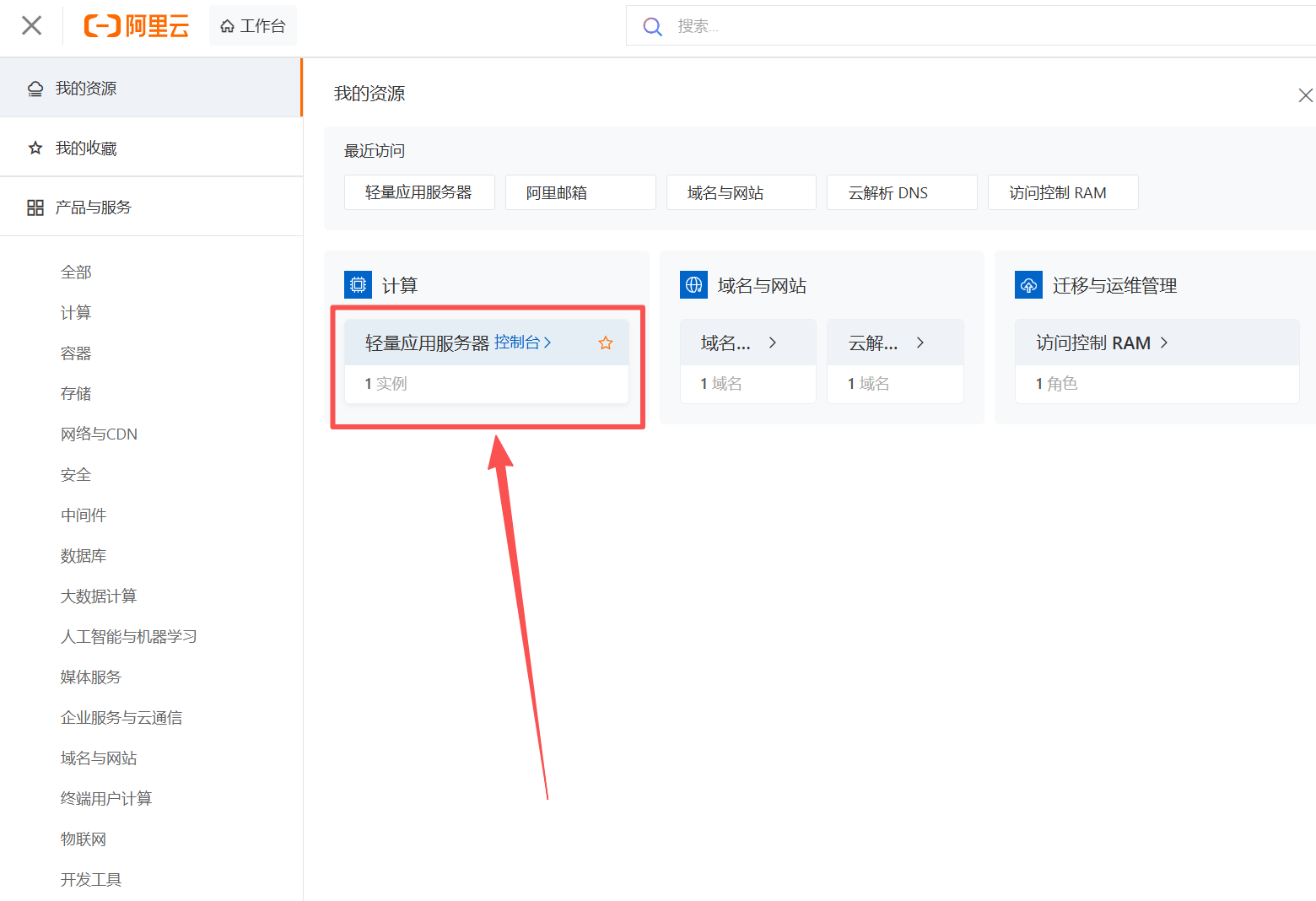 3、弹出的画面,点击【轻量应用服务器】