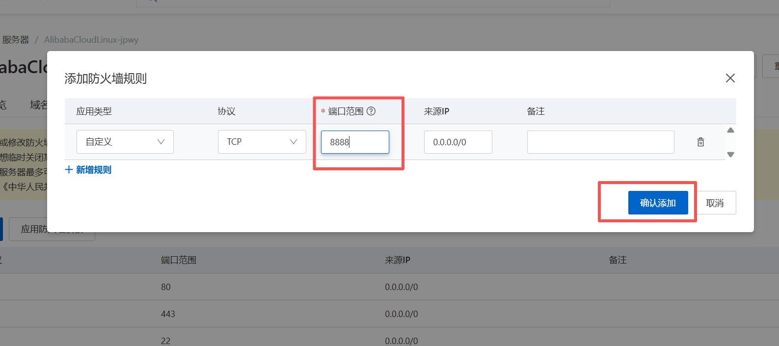 11、其他默认,在端口中输入数字:8888,是4个8,不要多也不要少了,然后点击【确认添加】