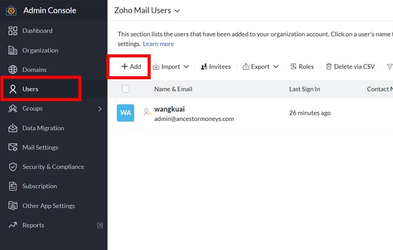 1、邮箱管理地址 https://mailadmin.zoho.com/ 使用管理员账号登录,可以进行全局管理,设置用户等。